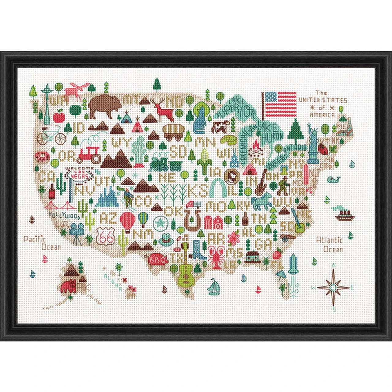 Travel the country as you stitch this pictorial representation of every state and corner of our nation. Counted cross-stitch kit includes white 14-ct. aida fabric, pre-sorted cotton floss, and needle. 18 × 14″ (46 x 36cm). Imported.