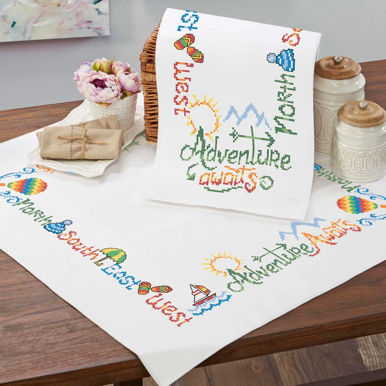 Herrschners Adventure Awaits Table Topper & Runner Stamped Cross-Stitch