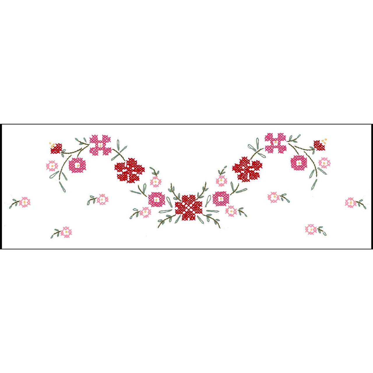 This floral dresser scarf features an arrangement of flowers in various sizes and shades in a gradient of pink and red colors. The floral garland is accented with little green leaves for spring or summer decorating. The design is stamped for embroidery on white cotton/polyester fabric with a perle edge. The 14 x 44″ (36 x 112cm) dresser scarf is pre-finished and ready for stitching. Simply follow the easy-to-read chart and instructions to stitch the design in the vintage colors of the Craftways Revival Floss Collection to create an instant family heirloom. Floss and needle are not included. Imported.