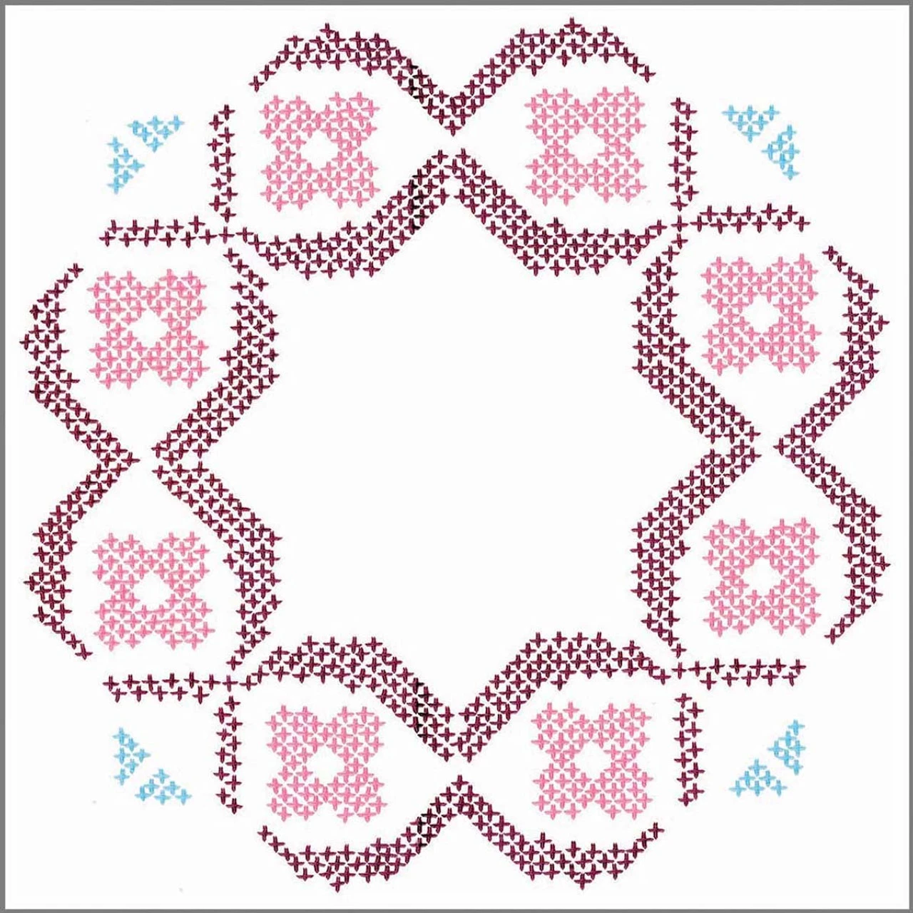 This beautiful floral quilt block design features rings of pink flowers arranged in a circular pattern with light blue accents in each corner. The design is stamped for cross-stitch on white cotton/polyester fabric. There are 6 quilt blocks in the set. Simply follow the easy-to-read chart and instructions to stitch the quilt blocks in the vintage colors of the Craftways Revival Floss Collection to create instant family heirlooms. Floss, needle, and finishing fabrics are not included. Each quilt block measures 18 x 18″ (46 x 46cm). Imported.