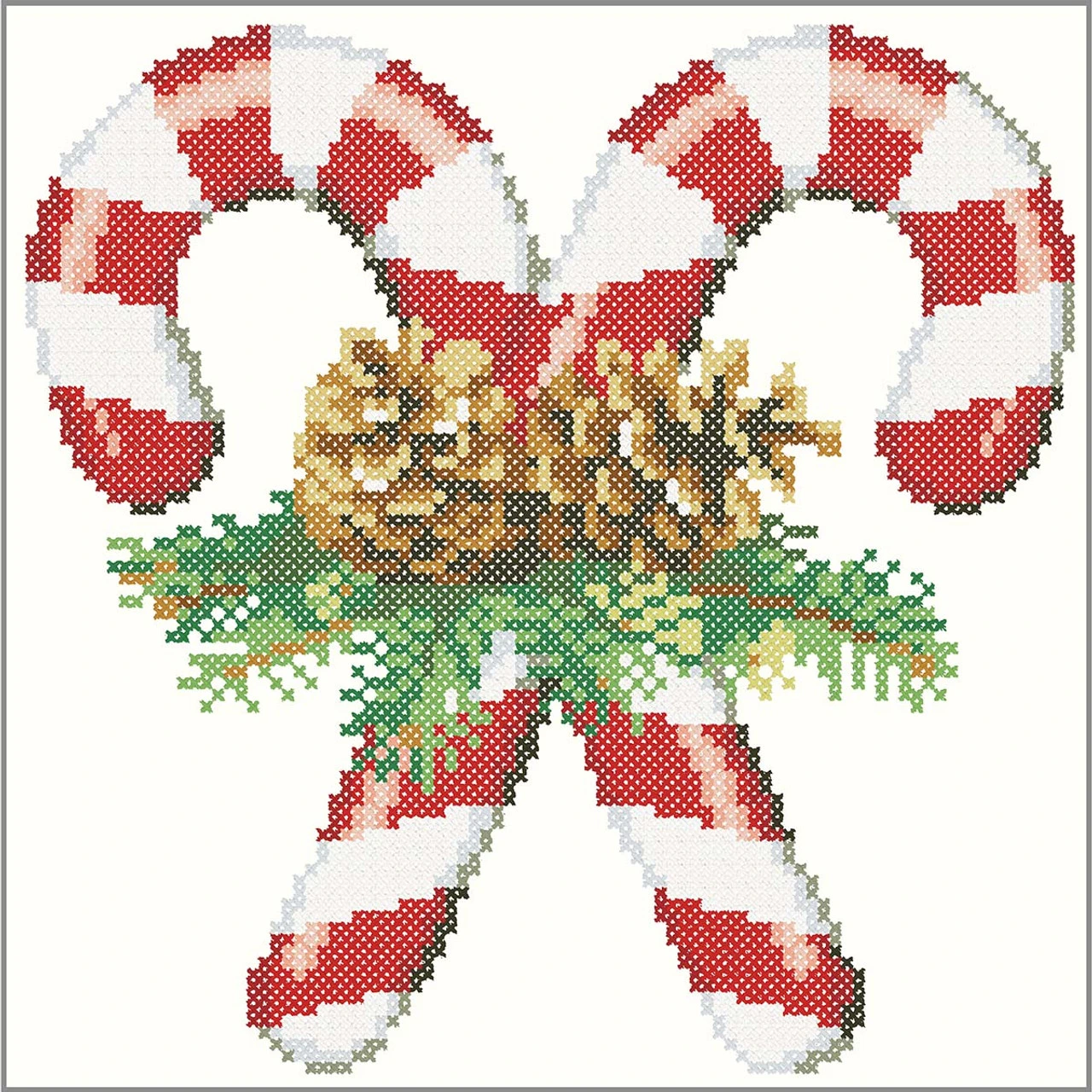 This Christmas quilt block design features a pair of candy canes tied together with pine branches and pinecones for a woodland twist on traditional holiday décor. The designs are stamped for cross-stitch on white cotton/polyester fabric. Simply follow the easy-to-read chart and instructions to stitch the designs. The completed quilt blocks can be finished as a quilt but also are perfectly sized to make throw pillows. Floss, needle, and finishing fabrics are not included. Each quilt block measures 18 x 18″ (46 x 46cm). Imported.