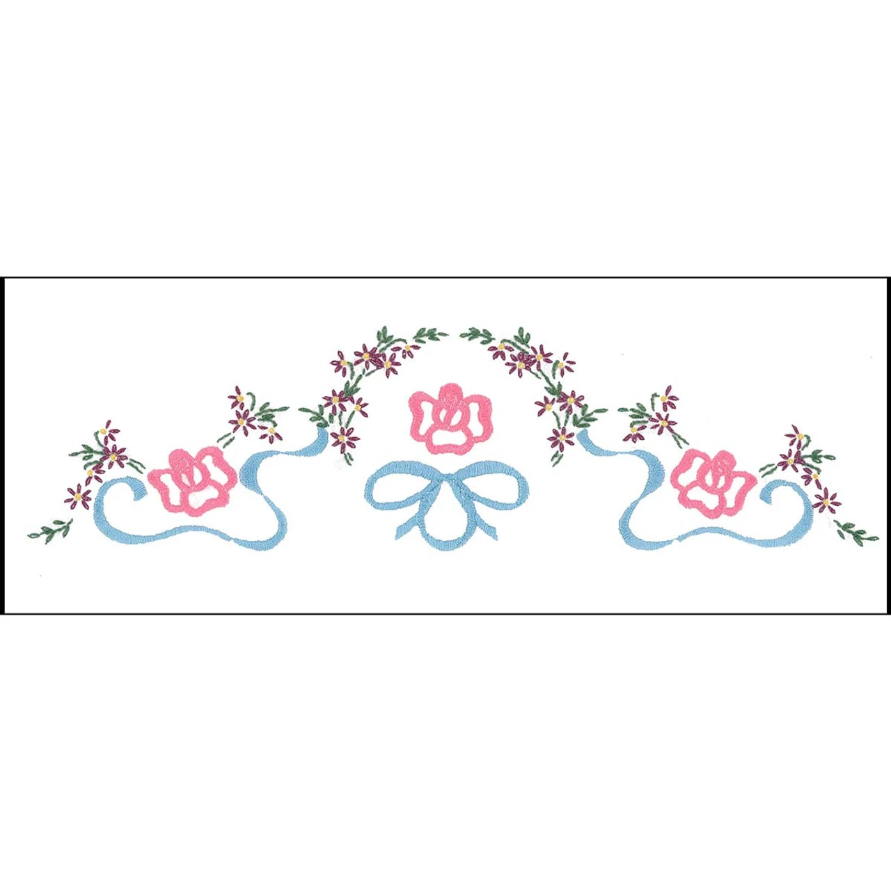 • This pre-finished dresser scarf is ready for stitching with a garland of little pink blossoms embellished with swirling blue ribbons and pink ribbon-like flowers.