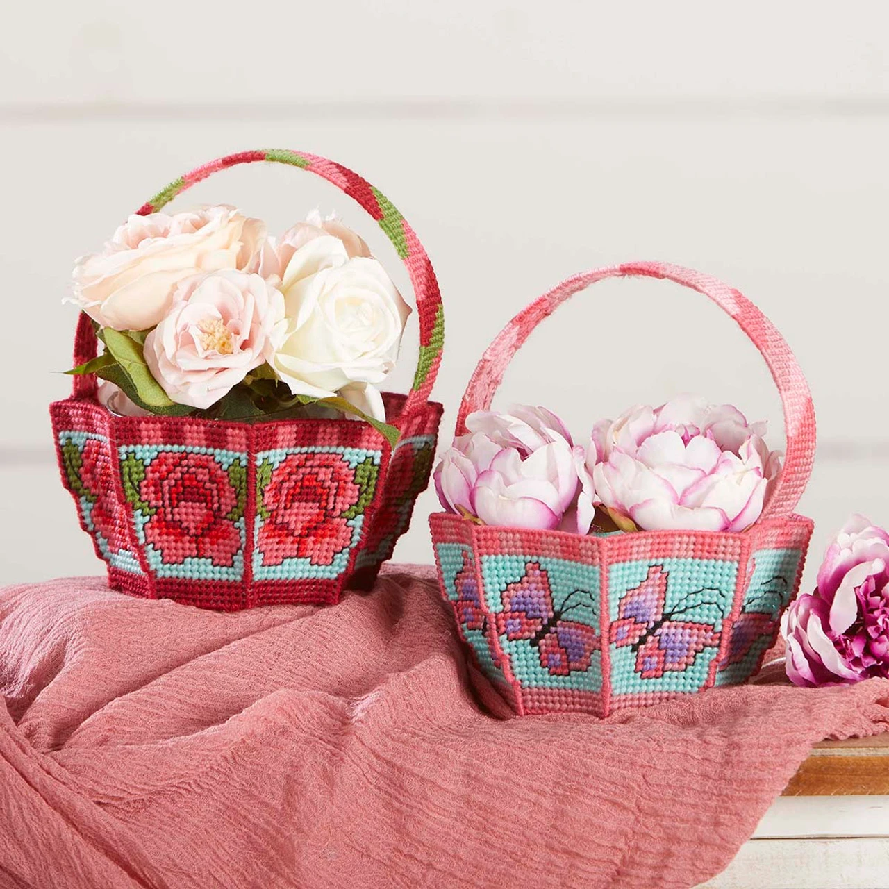 • These plastic canvas candy baskets feature a pink and teal basket with pink and purple butterflies and a red and teal basket with red roses.