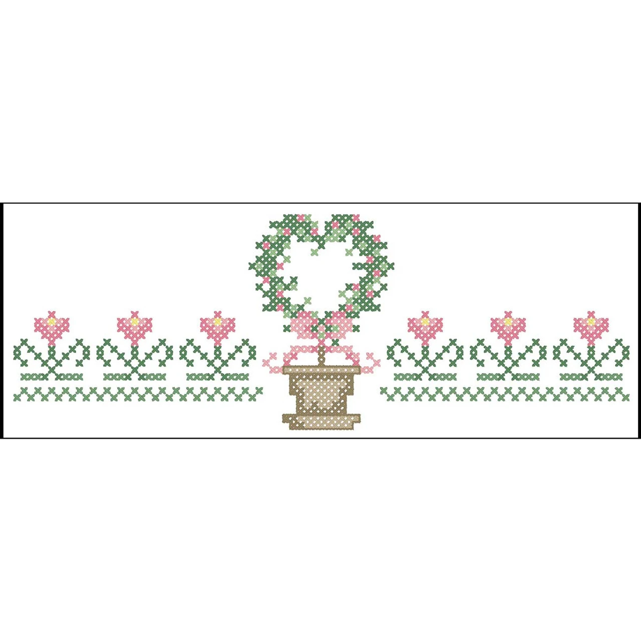 These spring cross-stitch pillowcases feature a beautiful flower garden with a decorative topiary of a heart-shaped wreath with a pink ribbon bow. Little pink flowers growing on each side complement the pink blossoms on the topiary.