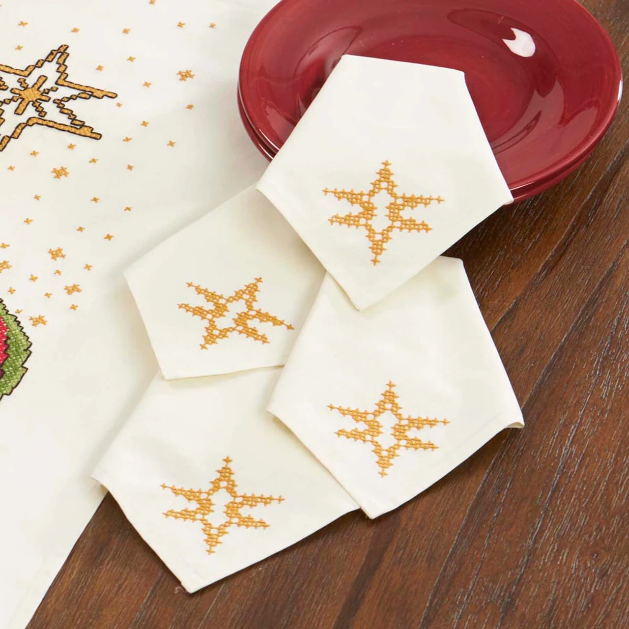 Rich gold stars are a striking accent on your holiday table. Stamped for cross-stitch on ecru cotton/polyester fabric with a hemmed edge. Set of four. 16 x 16″ (41 x 41cm). Imported from Europe.