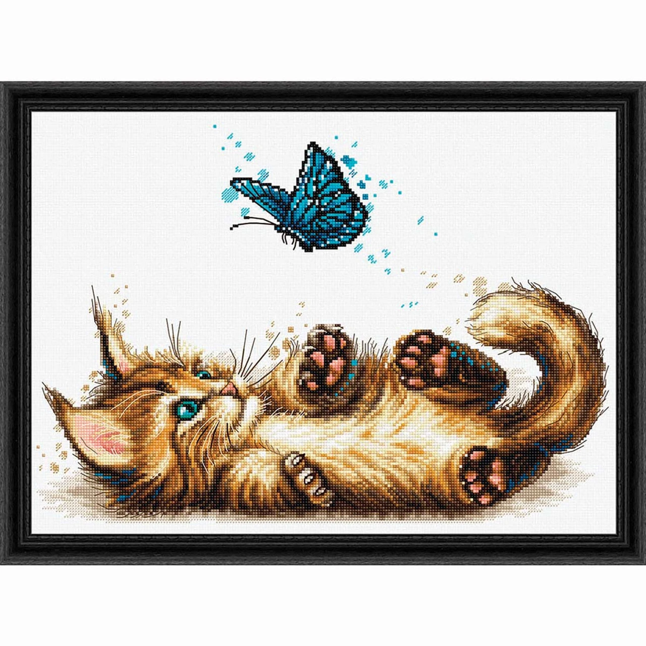 This playful counted cross-stitch design features a curious little kitten making a new friend in a beautiful blue butterfly. The furry kitty is shown laying on its back as it stares at the butterfly flitting around overhead. This design is stitched on white 16-ct. aida cloth. The easy-to-see squares of aida cloth make it a great fabric choice for both beginning stitchers and those with more experience. This complete counted cross-stitch kit includes white Zweigart 16-ct. aida cloth, cotton floss, needle, and instructions. The finished design measures 13 x 9″ (33 x 22.9cm). Imported from Europe.