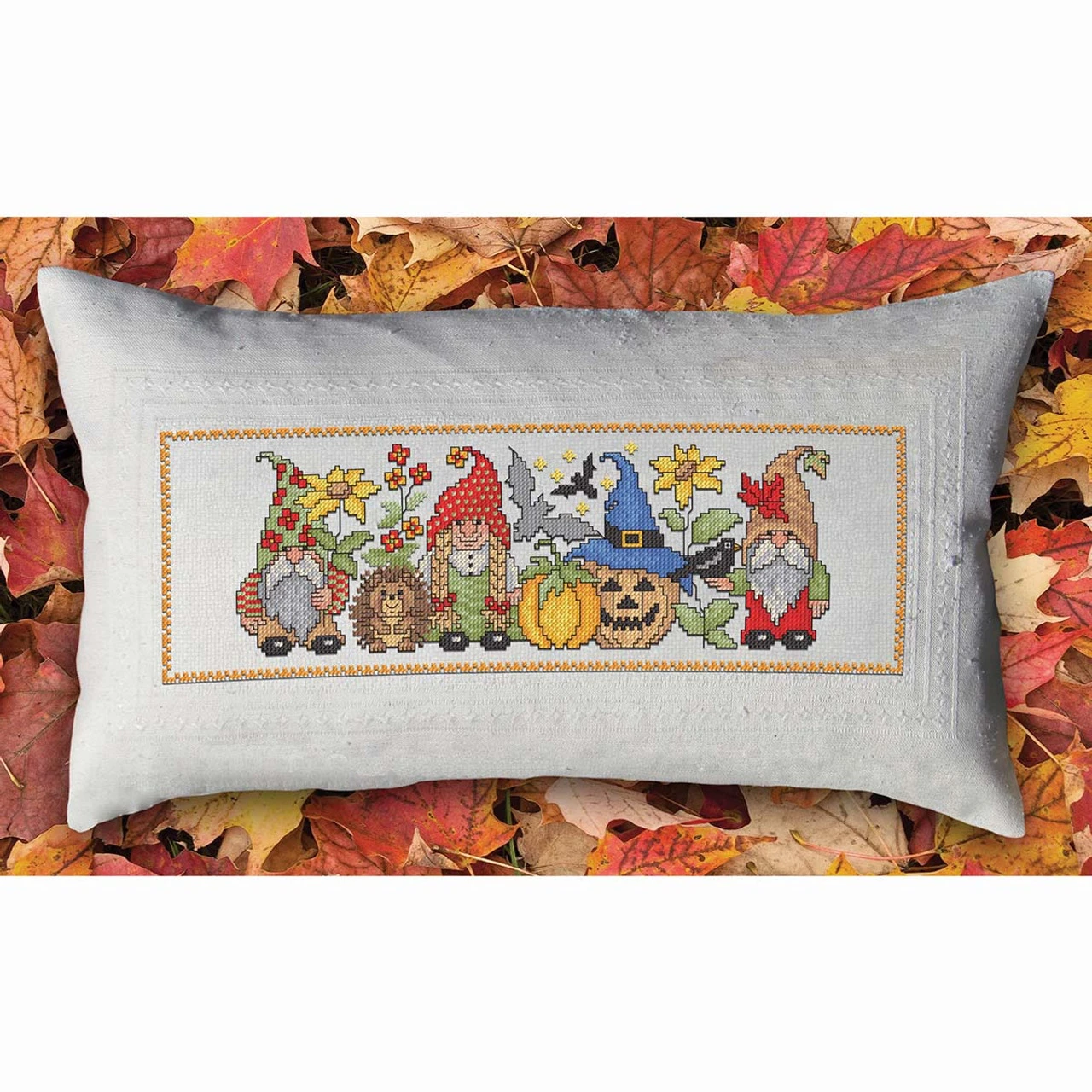 This fall counted cross-stitch pillow features a trio of gnomes enjoying the best of the season as they stand in a garden of sunflowers and autumn blooms accompanied by a grinning jack-o’-lantern in a witch’s hat, a hedgehog, a pumpkin, a crow, and bats. Their colorful clothes in shades of green and red add to the harvest vibe of this autumnal scene. This design is stitched on a pre-finished natural-colored 14-ct. aida cloth pillow cover with a zippered backing. The easy-to-see squares of aida cloth make it a great fabric choice for both beginning stitchers and those with more experience. This complete counted cross-stitch kit includes the pre-finished pillow cover, cotton floss, needle, and instructions. Pillow form not included. The finished pillow measures 20 x 11″ (51 x 28cm). Imported from Europe.