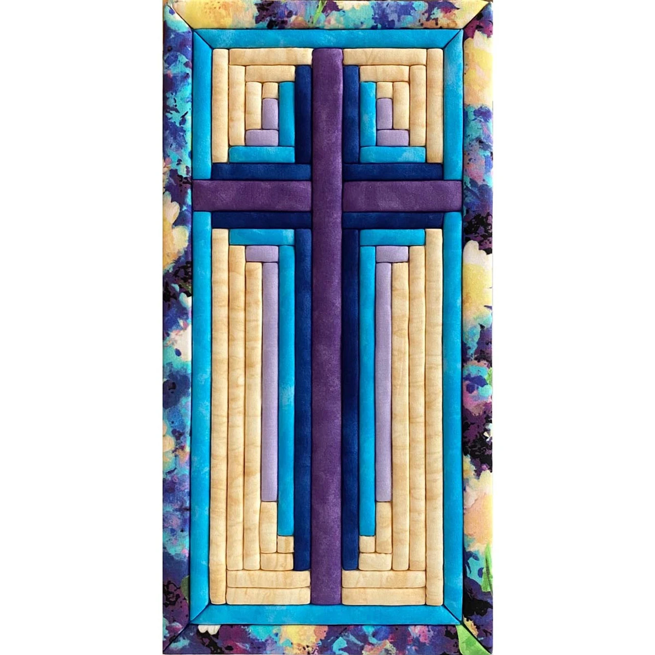 • No-sew quilted wall art features a large cross in shades of blue and purple.
