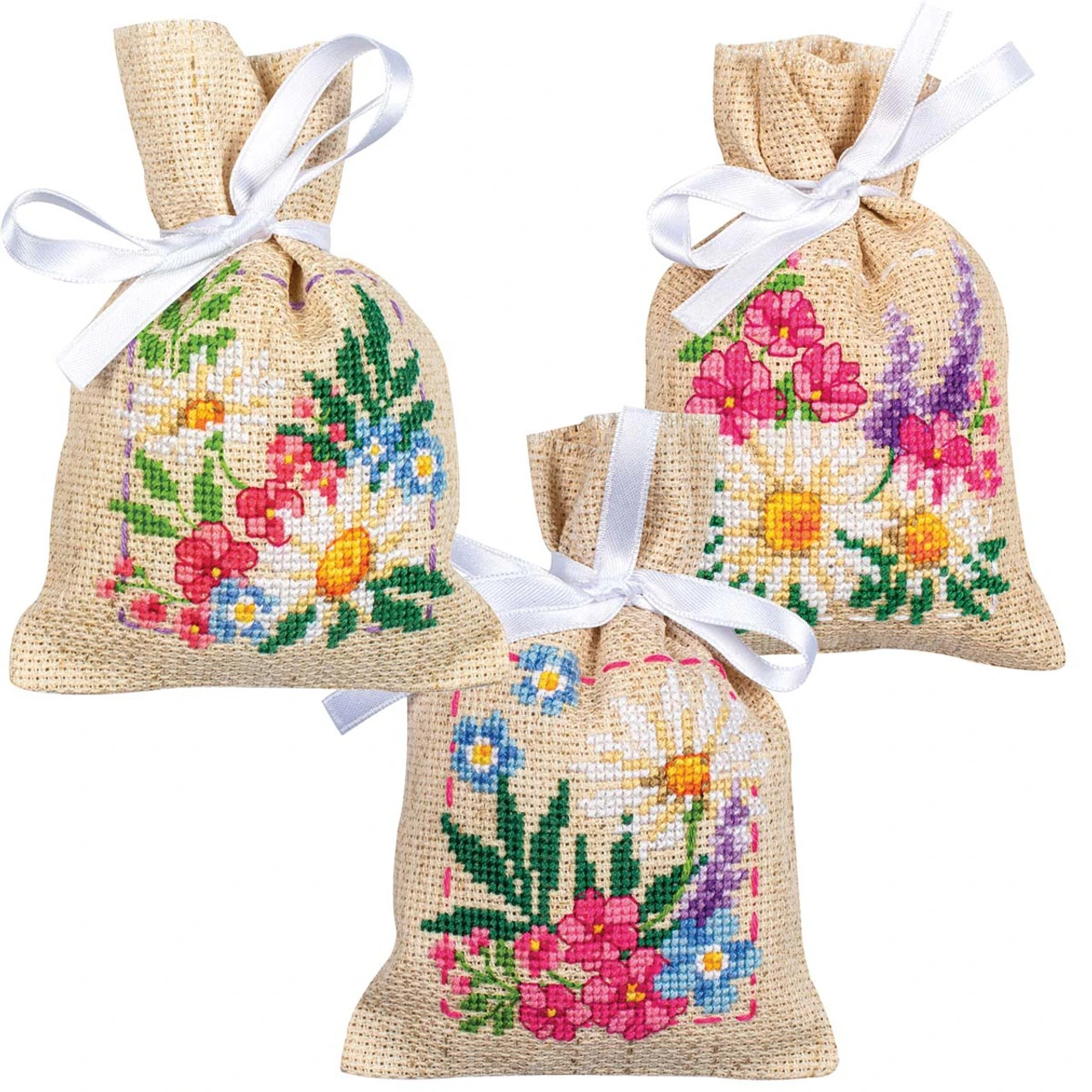 • This counted cross-stitch kit includes semi pre-finished linen-look 18-ct. aida cloth bags, DMC cotton floss, ribbon, floss organizer, needle, and instructions.